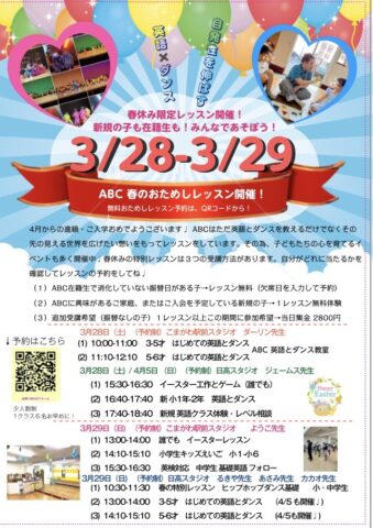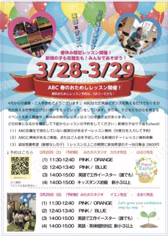 ABC 3月28日〜29日 春休み楽しいイベントレッスン開催! 在校生も新規の子も遊びに来てね♩